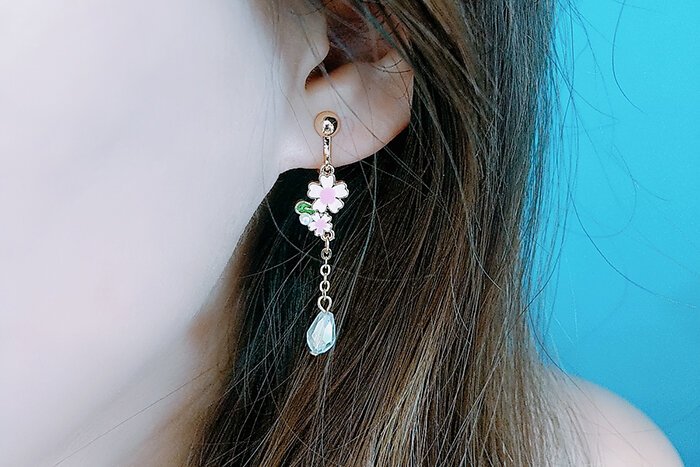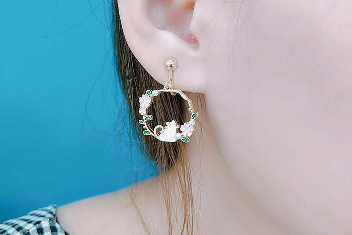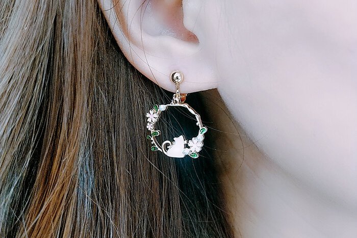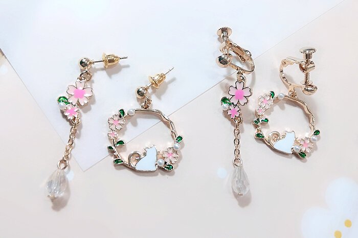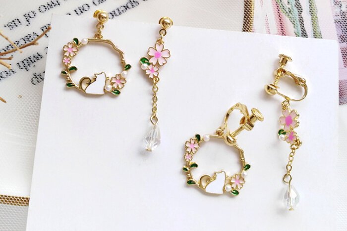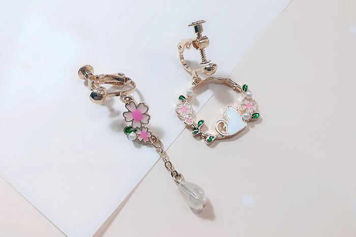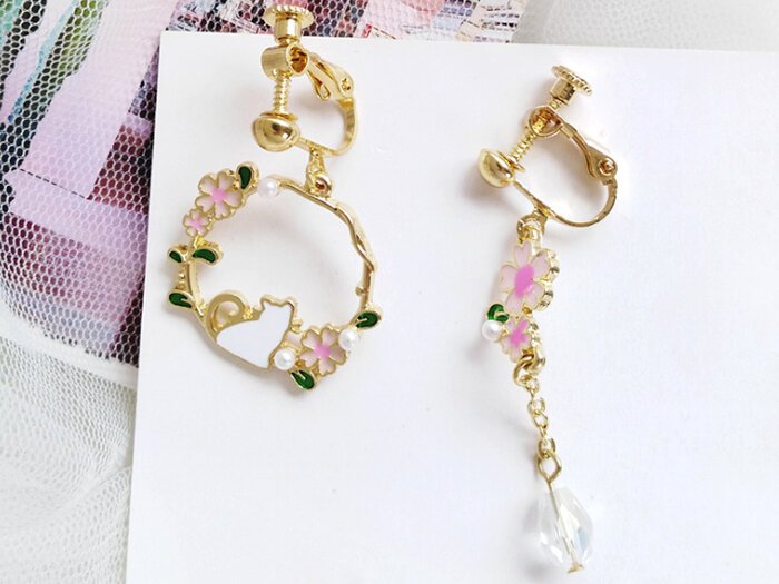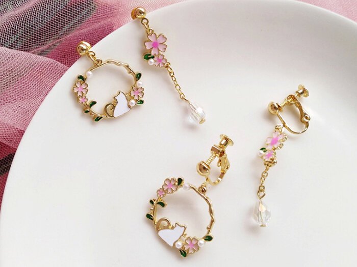 粉櫻藤花小貓咪×不對稱螺旋耳夾-第1張