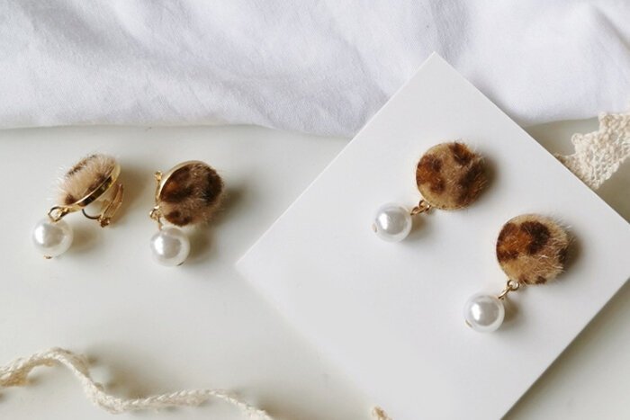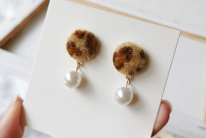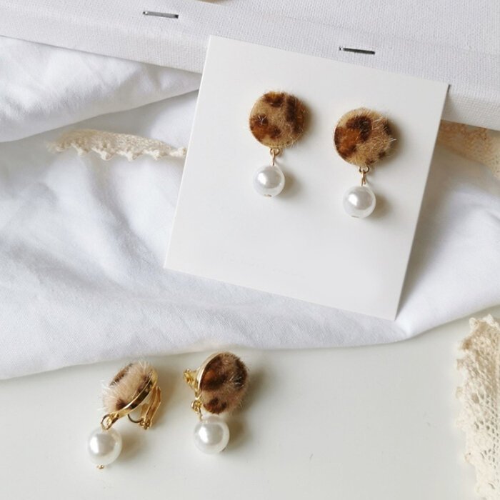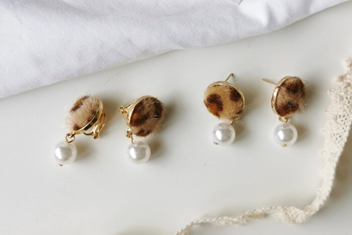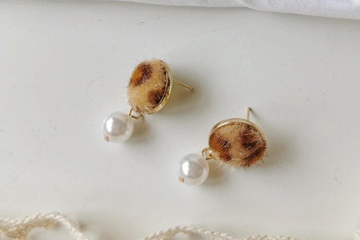 豹紋垂墜珍珠×吊墜耳環-第1張