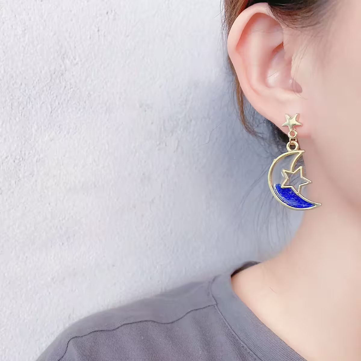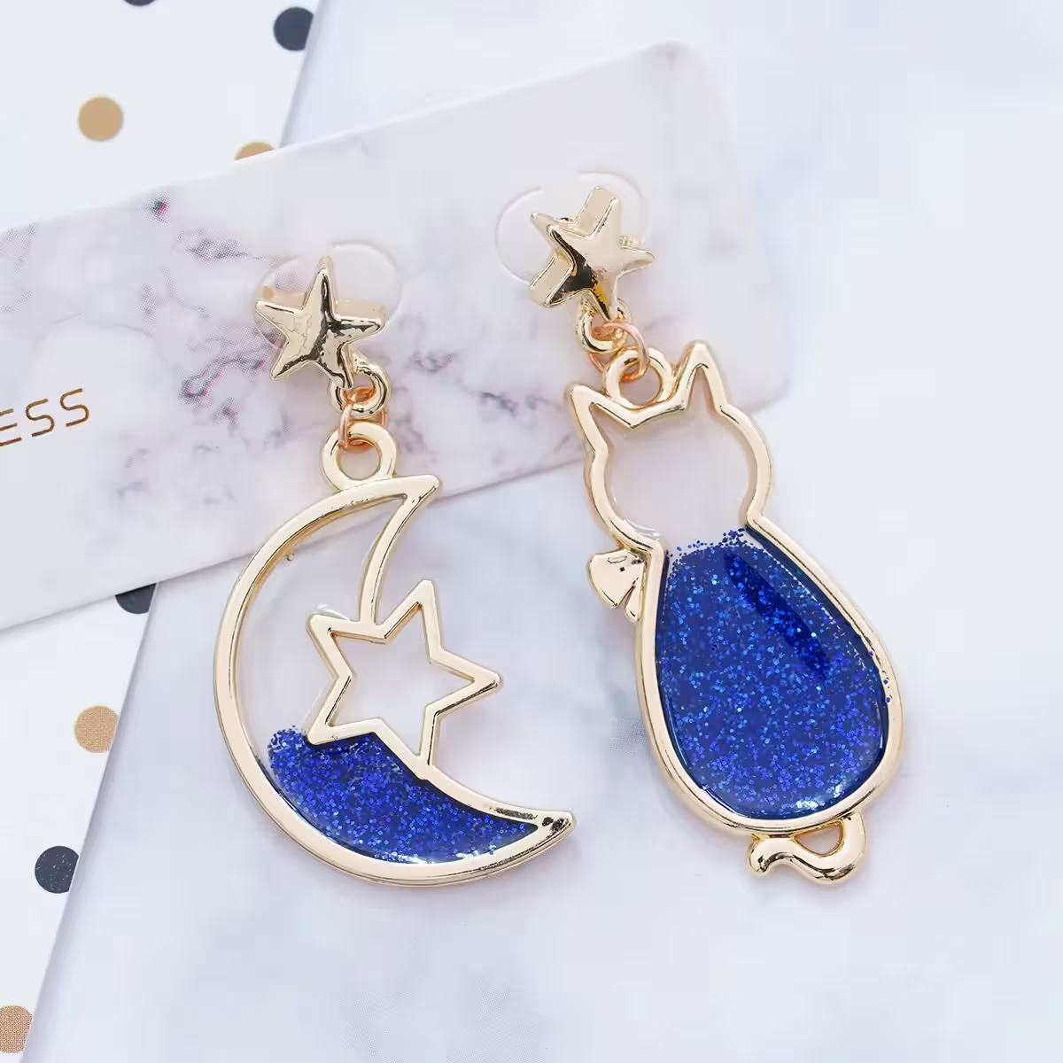 ▶名稱/藍色亮片貓咪星月×不對稱吊墜耳環