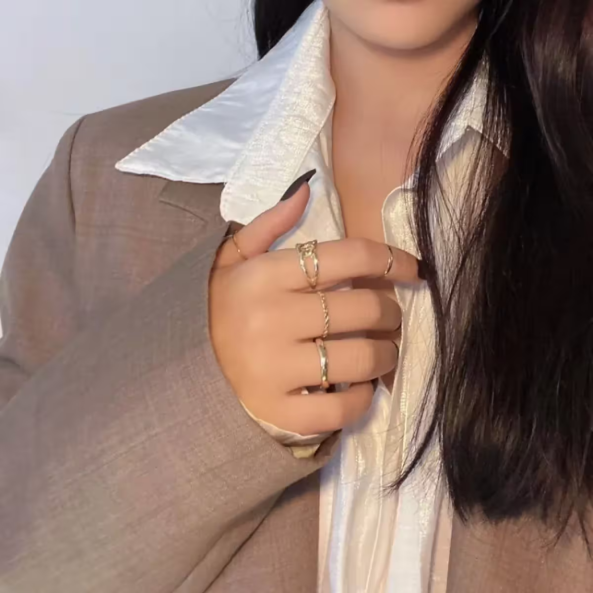 閱讀全文▶名稱/粗曠鍊條細圈麻捲×五套件戒指組×金色