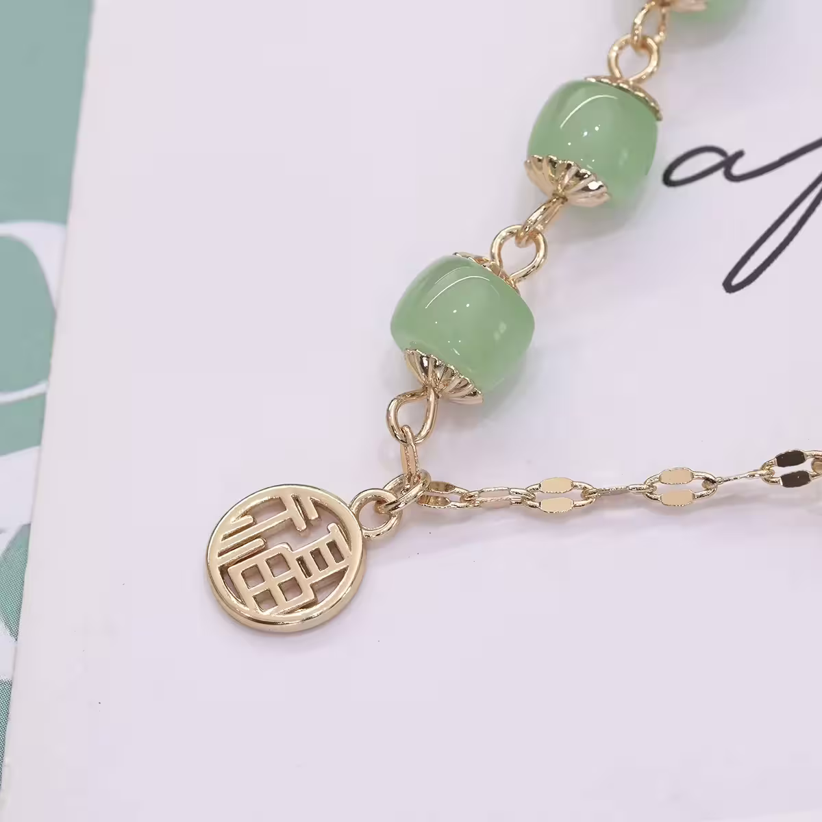 ▶尺寸/鍊長19cm,延長鍊5cm,綠珠0.8cm,吊墜長1.4cm