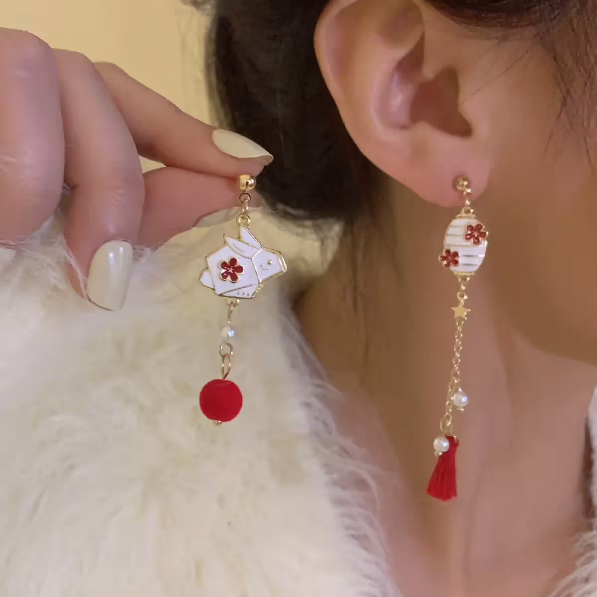 ▶名稱/紅花小兔燈籠×不對稱吊墜耳環