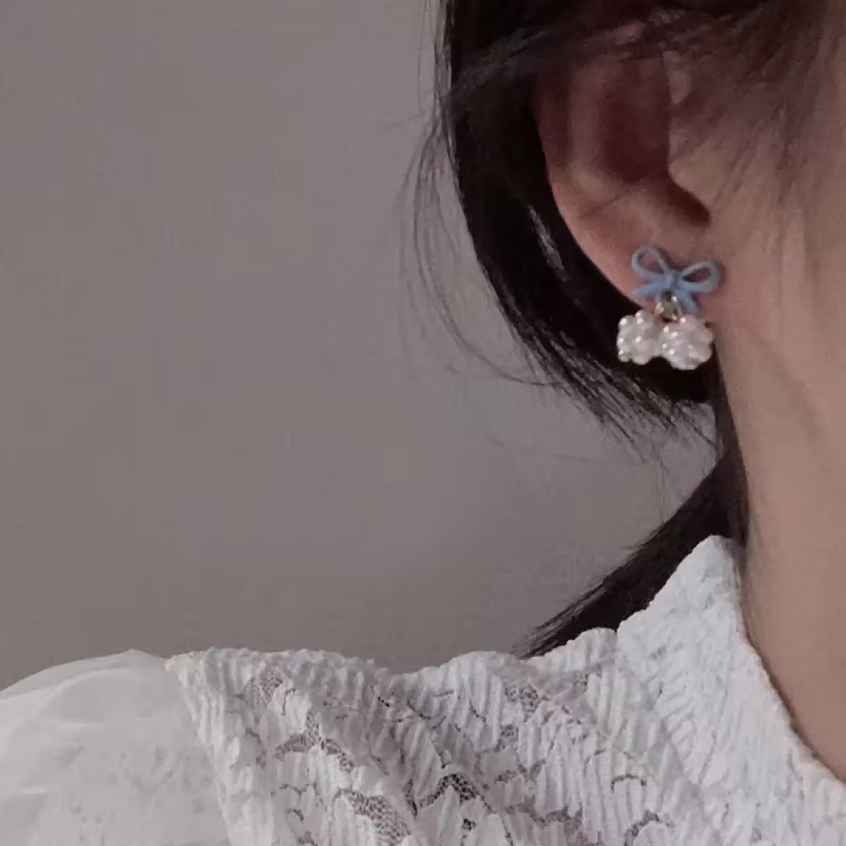 ▶名稱/藍色蝴蝶結珍珠球×三角耳夾