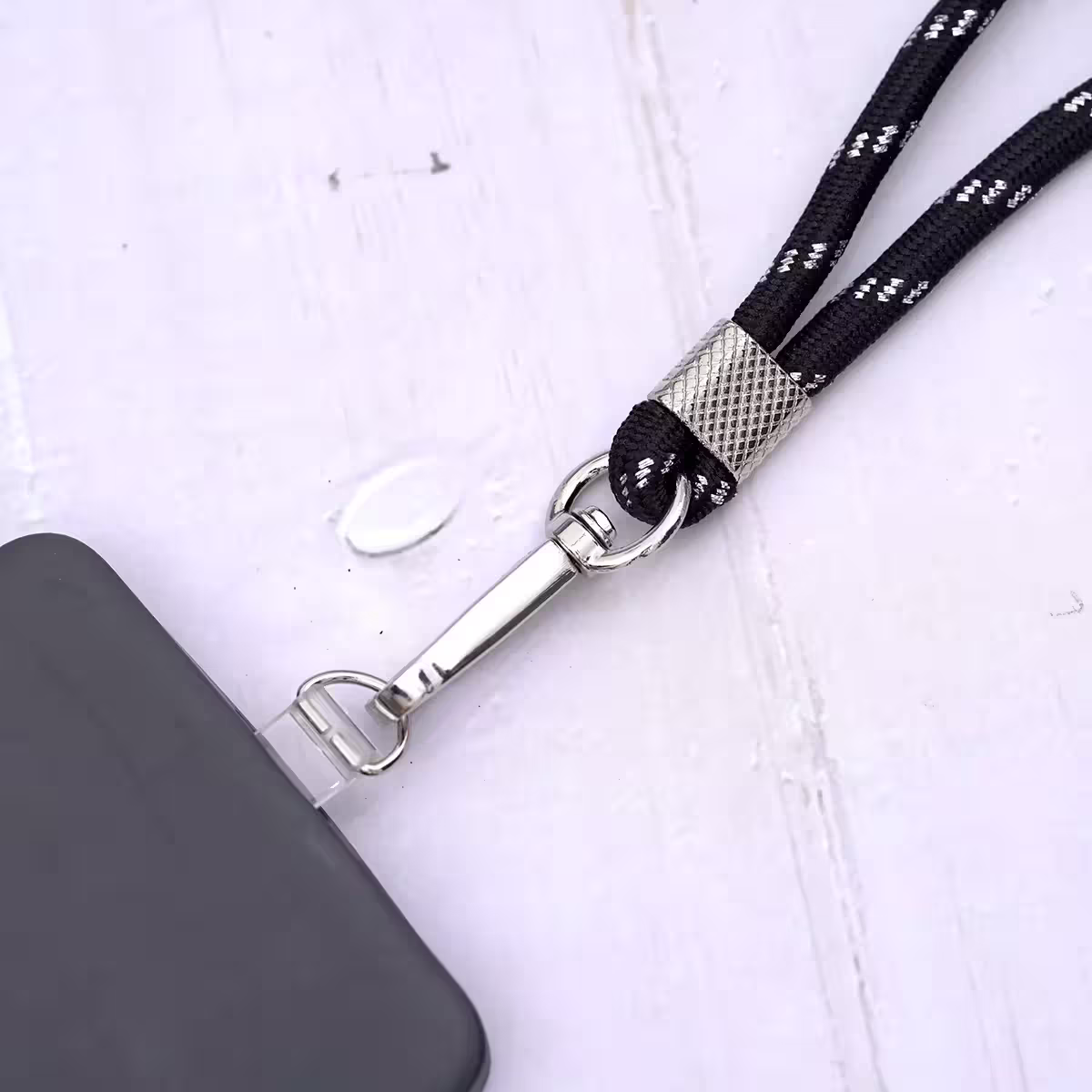 ▶名稱/銀蔥黑色布滌綸繩×手機斜背雙勾掛繩×銀黑色