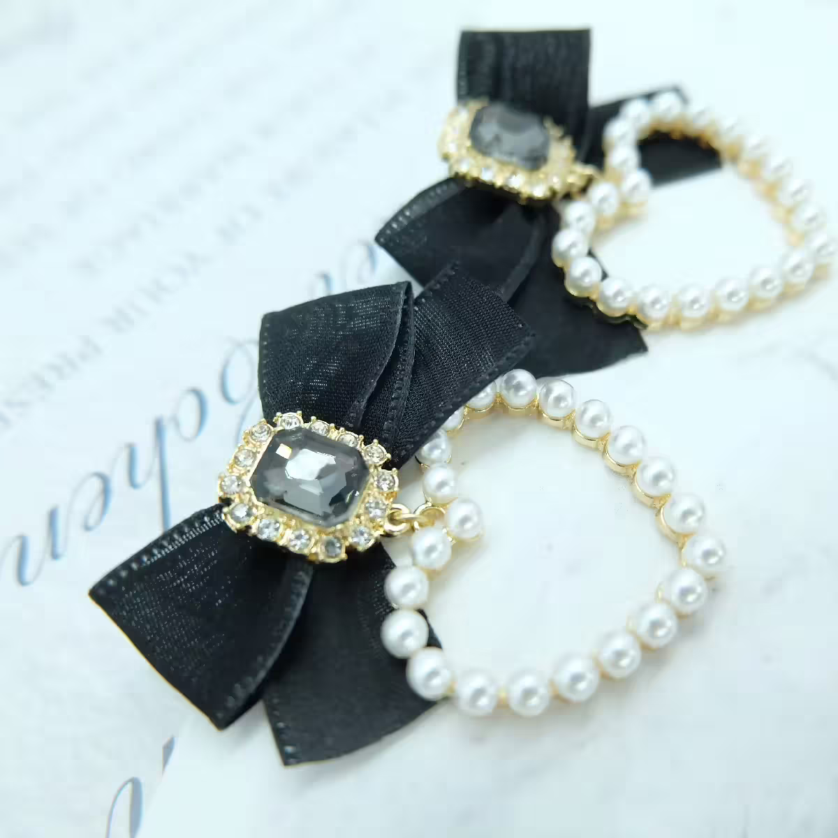 ▶名稱/黑緞面領結珍珠愛心×吊墜耳環