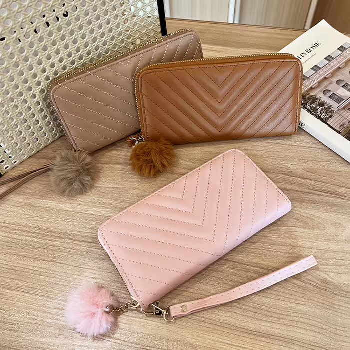 ▶名稱/V紋壓線毛球×手拿拉鍊長皮夾