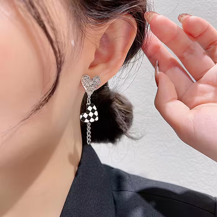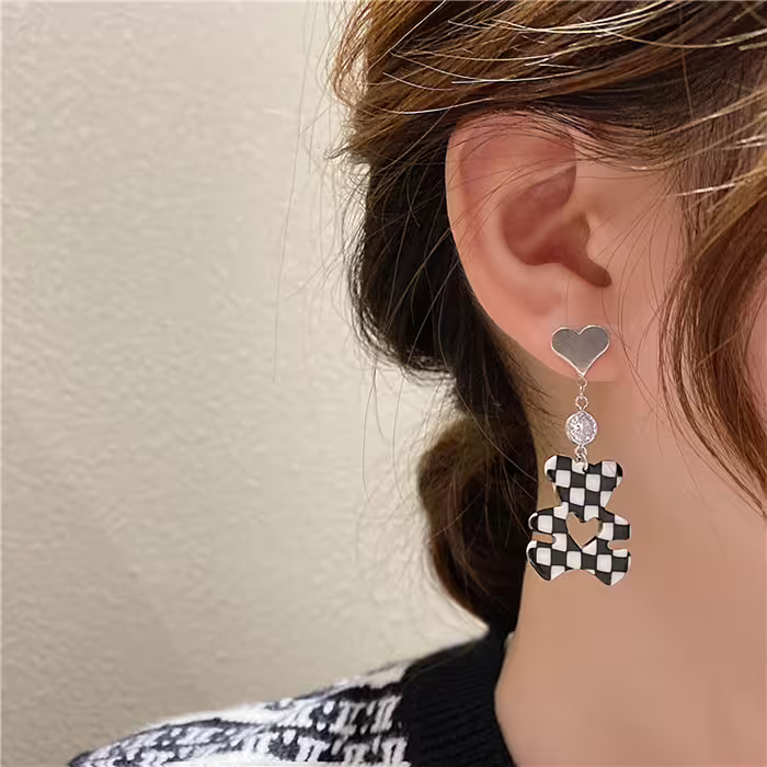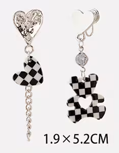 ▶名稱/黑白格紋小熊愛心×不對稱蚊香盤U型耳夾