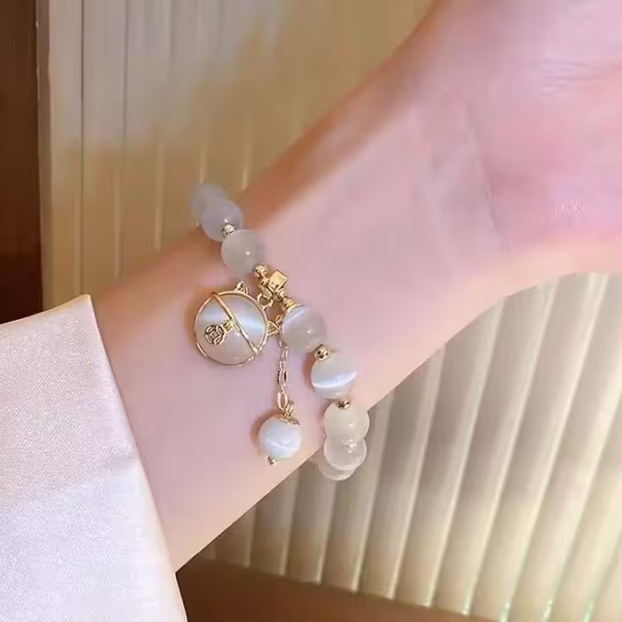 ▶名稱/白貓眼石招財貓×固定式串珠手鍊